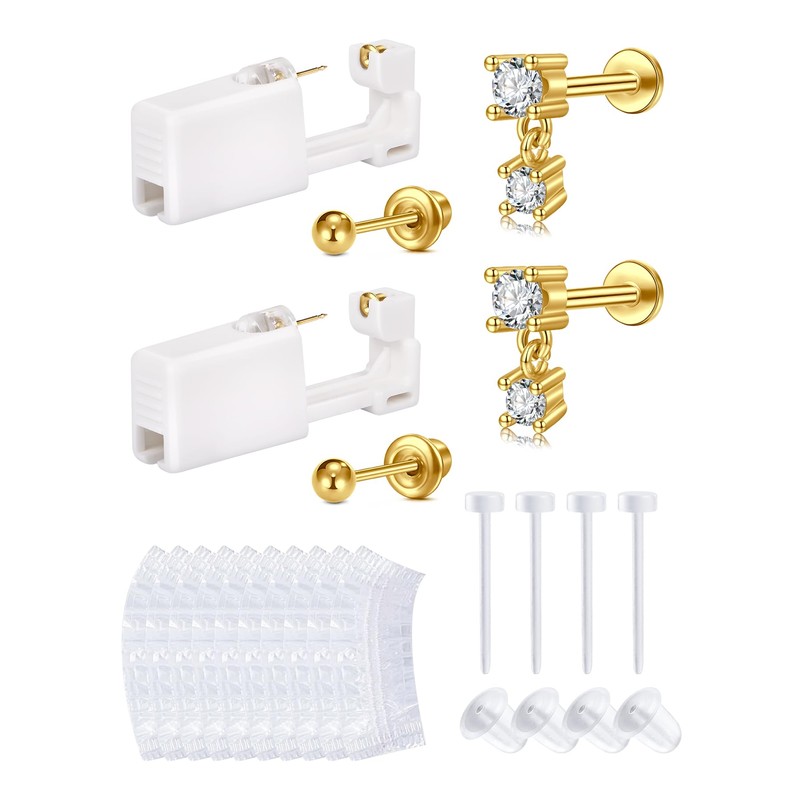 - Ear piercing gun kit include - 1pair gold disposable ear piercing kit with earrings + 1pair gold stud earrings + 2pcs clean pad + 2pairs clear earrings studs + 5 pairs of disposable waterproof earmuffs