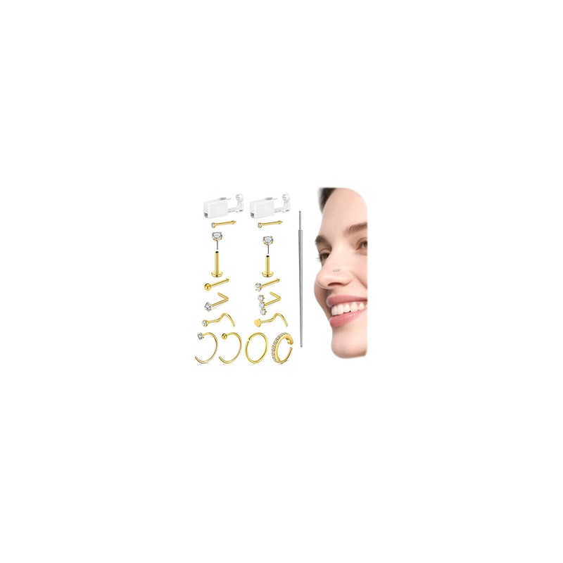QWALIT Nose Piercing Kit Nose Ring Piercing Gun Gold Disposable Nostril Piercings Kit with Rings Hoops Studs Self Nostril Piercings Gun Kits at Home Piercer Tool
