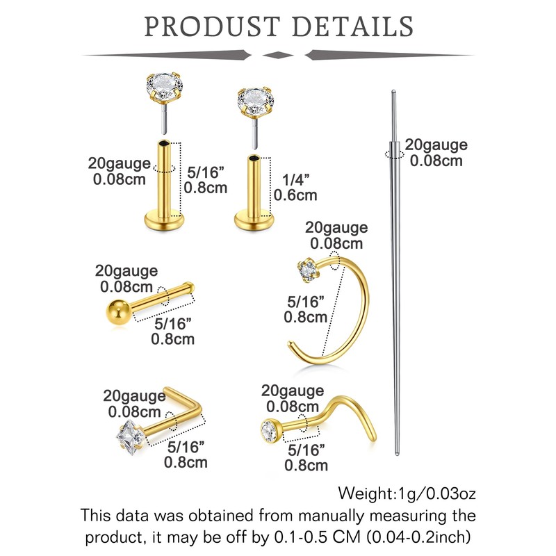 - Measurements - nose piercing gun built in nose studs 20 gauge * 7mm * 2mm, replacement nose studs 20 gauge * 8mm; threadless nose stud 20g * 1/4"(6mm) + 5/16"(8mm). Replacement nose ring hoops 20g * 5/16"(8mm);