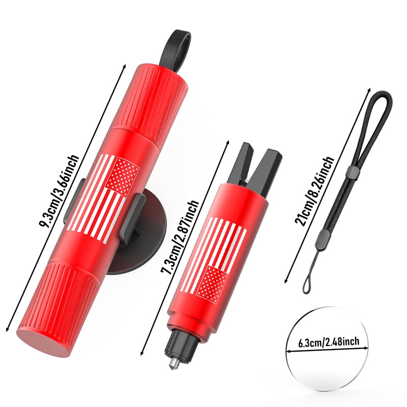 - Fashionable & Portable, Easy to Place: Each safety hammer comes with a base and hanging rope, elegant American flag pattern can make the safety hammer a decoration in your car. The shell is made of aluminum alloy, which can withstand high and low temperatures, compact design makes it easily accessible in the car and can be used to rescue yourself or others in emergency situations.