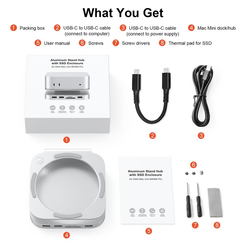 • What You Get: It includes UH60 Pro, quick start guide for users, screws and screw driver for SSD installation, silicone thermal pads for SSD, USB-C to USB-C cable for connecting to Mac mini, USB-C to USB-A cable for connecting to external power supply.