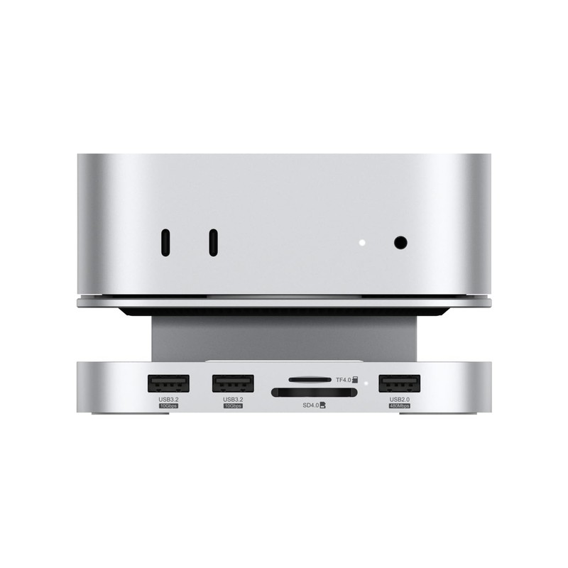 Qwiizlab Aluminum Stand Hub with SSD Enclosure, Docking Station for Mac mini M4/M4 Pro, 2 USB-A 10Gbps, TF/SD 4.0 Card Readers 312MB/s, USB-A 2.0, Fits M.2 NVMe SSD up to 8TB (Silver)