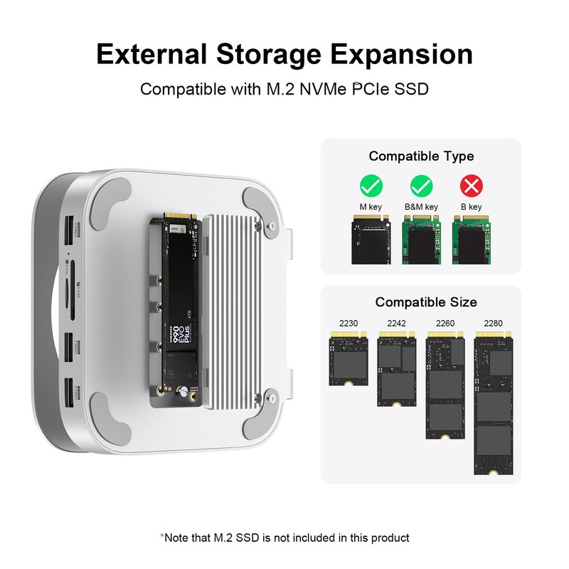 • External Storage Expansion: It includes the M.2 slot to support PCIe NVMe SSD up to 8TB capacity for your Mac mini M4/M4 Pro.