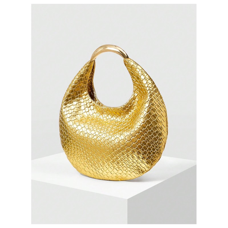QWINEE Women's Woven Handbag Elegant Clutch Purse Metal Top Handle Cresent Evening Bag Retro PU Leather Clutch Purse, Gold, One Size