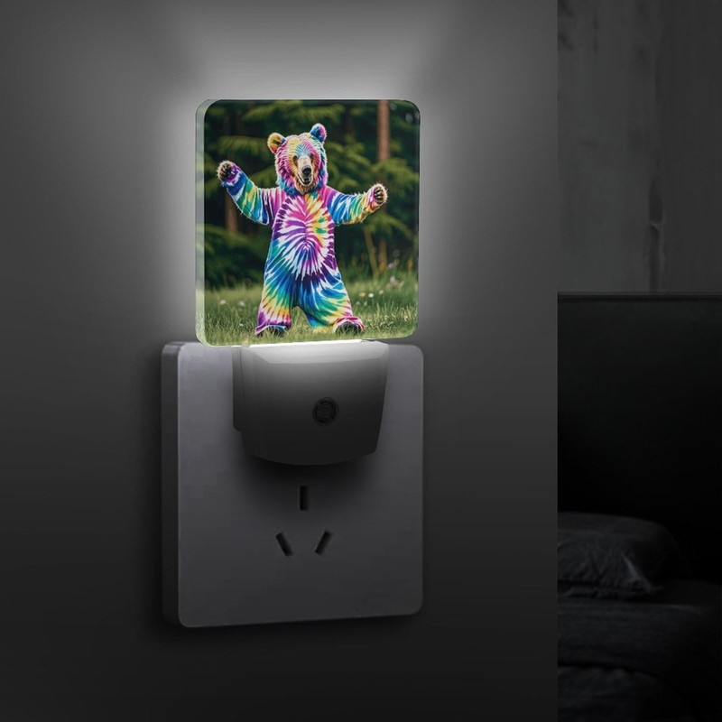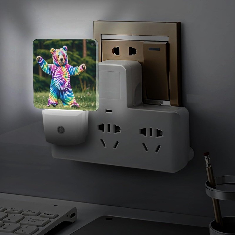 QWNMD Plug in Night Light Bear Dancing Tie Dye Printed Night Lights Plug Into Wall for LED Night Light for Bathroom Hallway Stairs Bedroom Kitchen Dusk to Dawn Sensor
