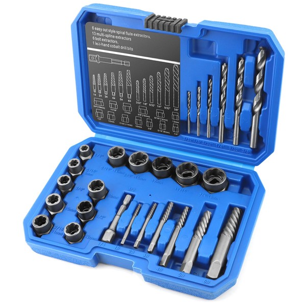 - Comprehensive 26-Piece Set: Includes 6 spiral screw extractors, 6 high-speed steel drill bits, 13 bolt nut removers, a 1/4" extractor extension, and a 1/4"-3/8” impact adapter.