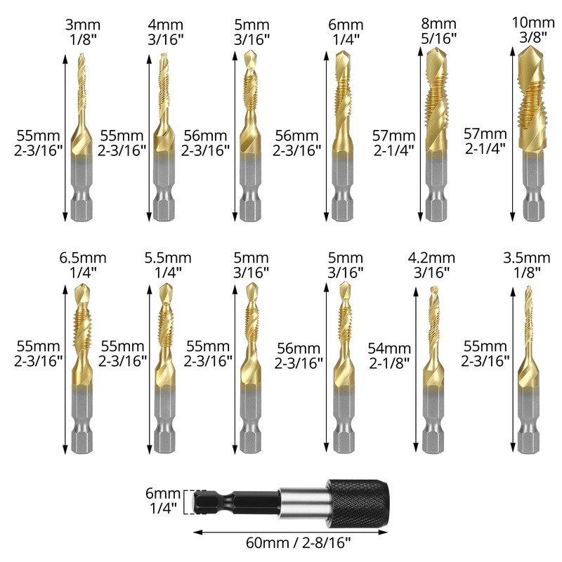 - Comprehensive Set: Includes 13 pieces with SAE (6-32NC to ¼-20NC) and Metric (M3 to M10) sizes, plus a quick-change adapter, catering to a broad range of applications.