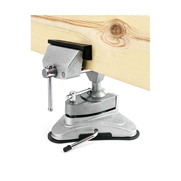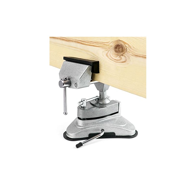 - Durable: Made of aluminum alloy, it is a portable mini, easy-to-use desktop fixture that can be used almost anywhere. Suction Cup Vise: Its base suction cup can be easily attached to any surface. With a simple turn of the locking lever, the three outer tabs will overlap the edge of the base and ensure a tight seal.