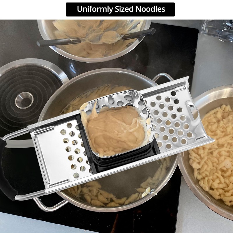 - User-Friendly Design: Designed with the user in mind, it features a built-in batter box that simplifies the process of making uniform spaetzle noodles. The sturdy, soft anti-slip grip handle ensures comfort and safety during use, while the smooth sliding mechanism enhances efficiency.