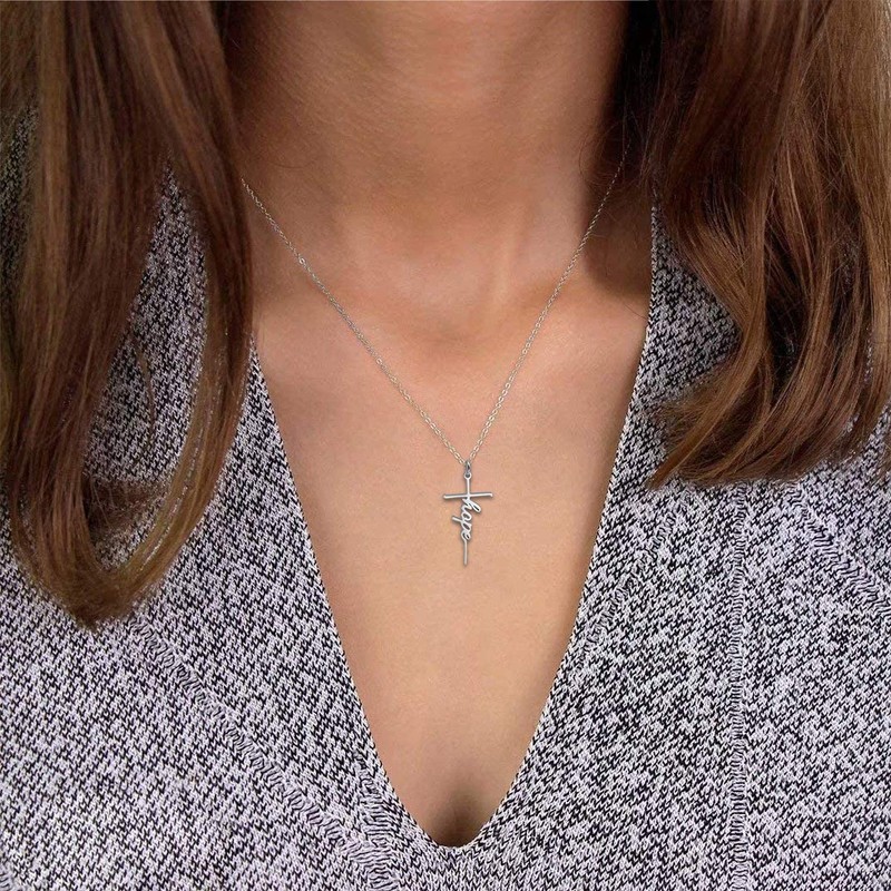 QXTX Faith Pendant Stainless Steel Cross Necklace Pray Belive Hope Grace Pendant Necklace for Women (Silver, Faith)