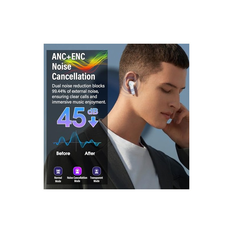 • ANC & ENC Noise Cancelling Technology: These noise cancelling earbuds feature advanced ANC noise canceling technology, which uses a microphone to pick up external noise and generate reverse waves to cancel it out. This feature effectively reduces ambient noise and provides an immersive listening experience. In addition, thanks to the ENC chip, the bluetooth earbuds can filter out background noise during calls, providing clearer and crisper calls.