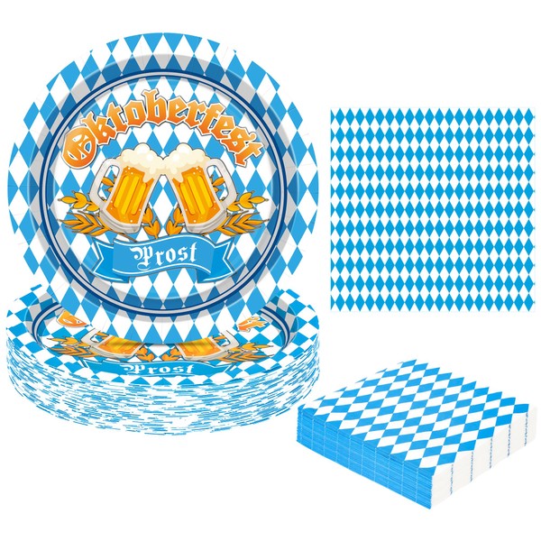 QZYL 50 Sets Oktoberfest Party Plates and Napkins Sets, 9" Disposable Beer Festival Paper Plate, Round German Party Decorations, Blue and White Flag Check Tableware Set for Oktoberfest Decorations