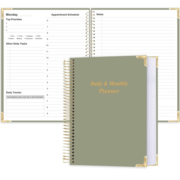 Qzyoneei Undated Daily Monthly Planner for 2025 2026 - A4 To Do List with Hourly Schedule, Hardcover Spiral Bound Daily Planner to Increase Focus, Stylish School/Office Supplies, 8.5" x 11", Green