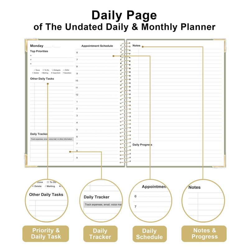 - Superior Quality - The productivity planner with thickened cardboard cover and metal corner protectors make it more sturdy and durable. It features a strong metal lay-flat single coil binding, and comes with a built-in pocket for storing small items, as well as an elastic strap to help protect the planner.