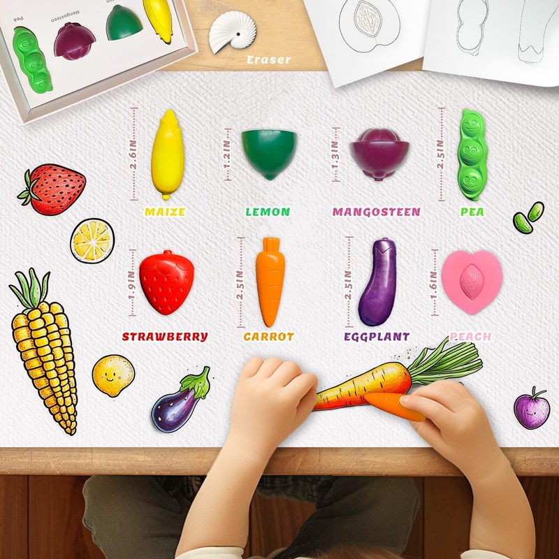 This Crayons set have eight different vegetable and fruit shapes, including strawberry, peach, corn, lentils, lemon, mangosteen, eggplant, carrot, very cute crayon shape.These big crayons are designed to fit toddlers' palms so they can easily make their first marks.