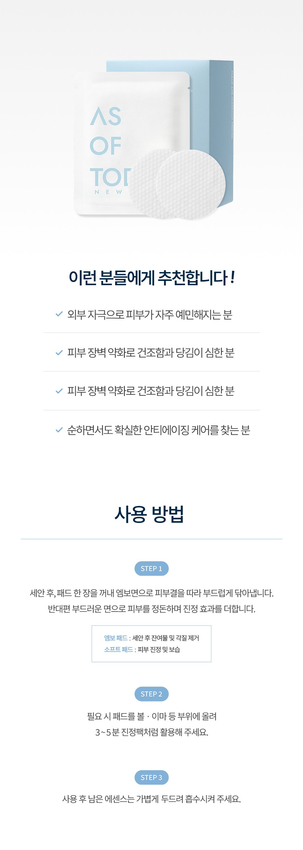- how to use: 1. After cleansing, take out one toner pad and gently wipe it in the direction of your facial texture. 2. For dry areas, place the pad for 1-3 minutes like a spot pack and then gently tap to absorb. 3. After finishing absorption with your hands, proceed to the cream/sunscreen step.