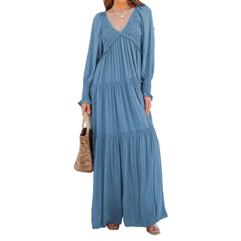 - FEATURES: Womens Flowy Maxi Dress, Casual & Boho Style, Loose & Flattering Fit, 100% Polyester Fabric, Long Sleeve, V Neckline, Empire Waist, Elastic Ruffle Cuffs, Elastic Details on the upper body, Ruched Design at Chest and Back, Ruffle Flowy Hem, Floor Length. Holiday Dresses for All Seasons.