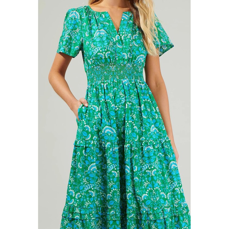 R.Vivimos Women's Summer Cotton V Neck Short Sleeve Boho Floral Print Elastic Smocked Waist A-Line Midi Dress with Pockets (Large, Green-Floral)