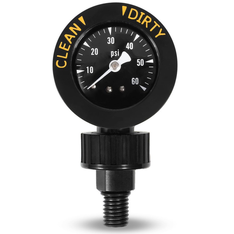 - Clean and Dirty Filter: Pressure range: 0-60 psi, 1/4" Mpt. This air gauge release valve assembly has a twistable bezel to indicate desired pressure of start and clean filter, letting homeowners know it's time to clean the filter. For safety, make sure the indicator level does not reach high. Clean the filter in time!