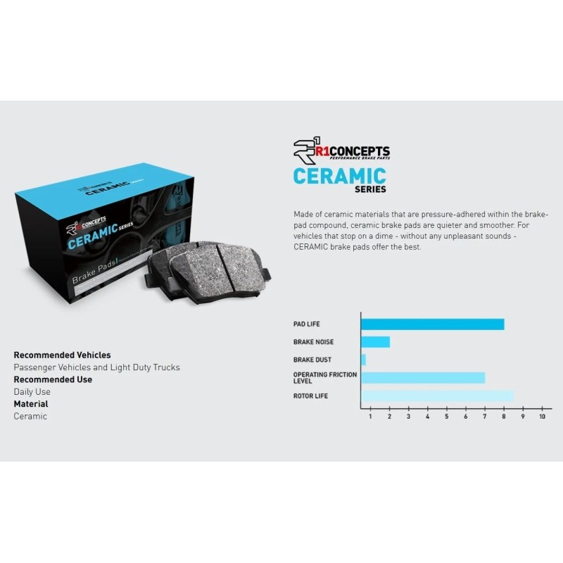 R1 Concepts Ceramic Series brake pads have a special formula that is designed to be low dust, asbestos free, and provide excellent fade resistance. The formula that is used by R1 brake pads is similar to OEM, both in terms of raw materials and the processes that are used to construct them. Because of this, car owners can have peace of mind when investing in new R1 Concepts Ceramic Series brake pads. R1 Concepts Ceramic Series Brake Pads are environmentally friendly and adhere to the low copper requirements under California and Washington restrictions for 2021/2025.