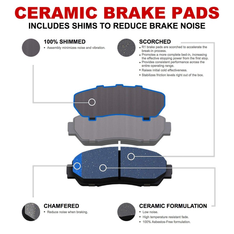 - Low Dust & Noise: Brake pads come with shims to eliminate noise. Low dust, asbestos free special ceramic formulation provides excellent fade resistance. Top choice for front and rear brake pads replacement.