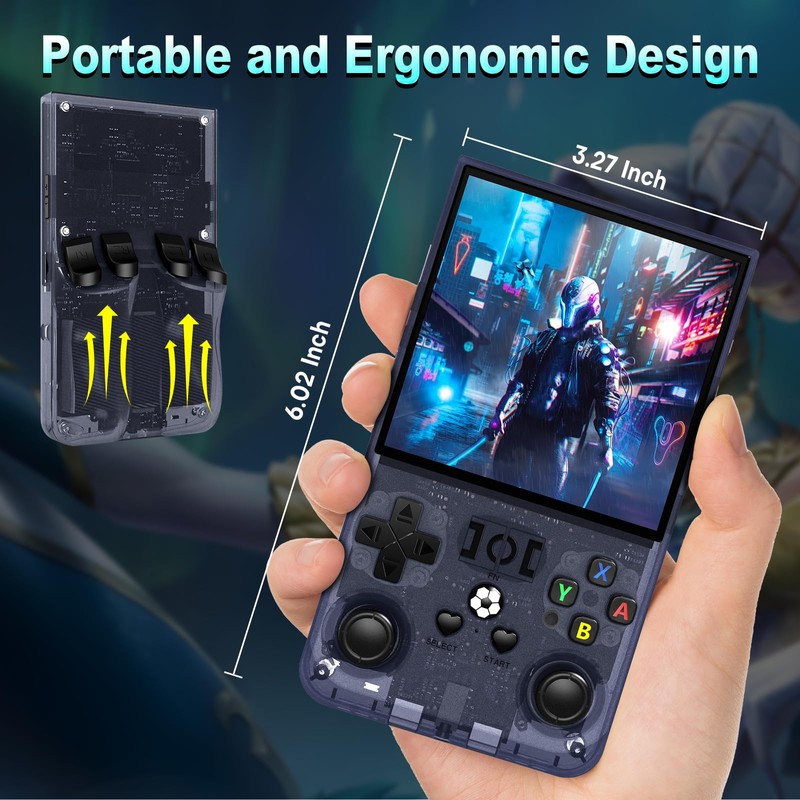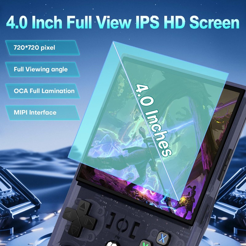 - 【 4.0 Inch IPS Screen 】R36MAX mini retro game console with 4.0 inch IPS full-angle screen and a resolution of 720*720 brings your games to life with stunning visuals. Enjoy bright colors and sharp graphics that enhance your gaming experience. The full lamination technology reduces glare and provides a crystal-clear view from any angle, making hand held game console perfect for gaming on the go.