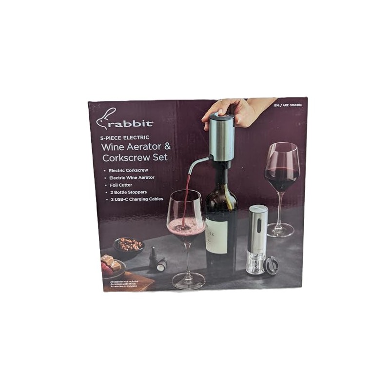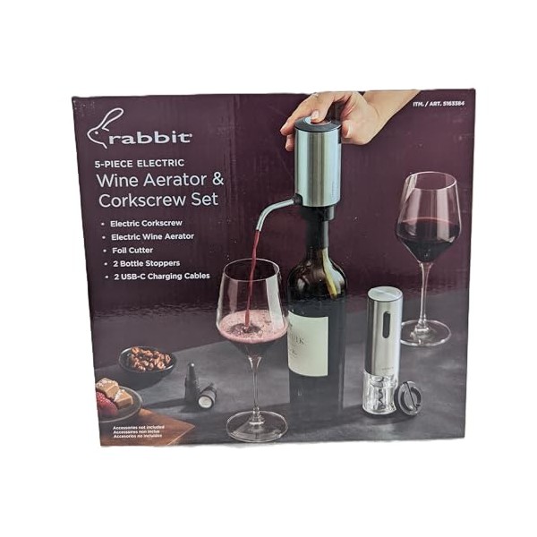 Rabbit Electric Wine Tool Set - 5-Piece Wine Accessory Collection - Aerator, Corkscrew, Cutter, Stoppers, Charging Cables