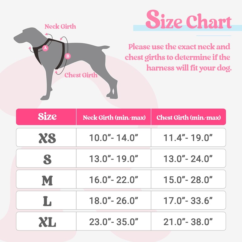 - Fully Adjustable - This adjustable harness features 4 easy adjusting straps around the body. You can use its 2 neck straps and 2 chest straps to create a perfect fit for your dog with some room of growth. No worries about slipping out or choking