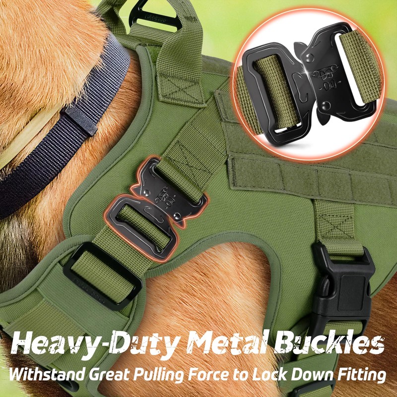 - Military-standard Material: Heavy duty vest made of 1050D Nylon with sturdy stitching for extra durability and wearability, suitable for all field use. Two Metal Shoulder Buckles can bear great pulling force, ensuring your dog is safely harnessed during training, hunting, working, and any other occasion. Well padded in every pressure load point to protect your dog, while the breathable air mesh keeps your dog ventilated and comfortable