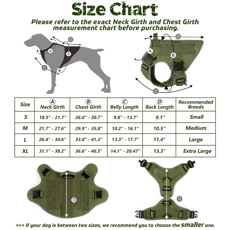 - Medium Dog Molle Vest: Neck Girth: 21.7” - 27.6” (55.1 - 70.1cm), Chest Girth: 29.9” - 35.8” (75.9 - 90.9cm), Belly Length: 10.2” - 16.1” (25.9 - 40.9cm), Back Length: 10.5” (26.7cm). Ideal for Medium Breeds such as Boston Terriers, Dachshunds, Heelers, Bulldogs, Boxers, Puggles, Australian Shepherds, etc. A professional working dog vest for service, police, or military dogs, but also suitable for hunting and all outdoor companion dogs