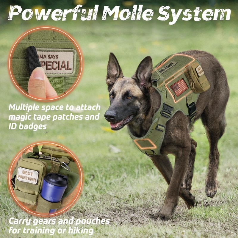 - Practical Design For Versatile Use: Molle system equipped on both sides for pouches, water bottles, and tactical dog gear. Multiple Hook & Loop Panels for morale patches and badges to showcase your dog’s personality. A wide range of use for personal service, law enforcement, hunting, or outdoor recreation