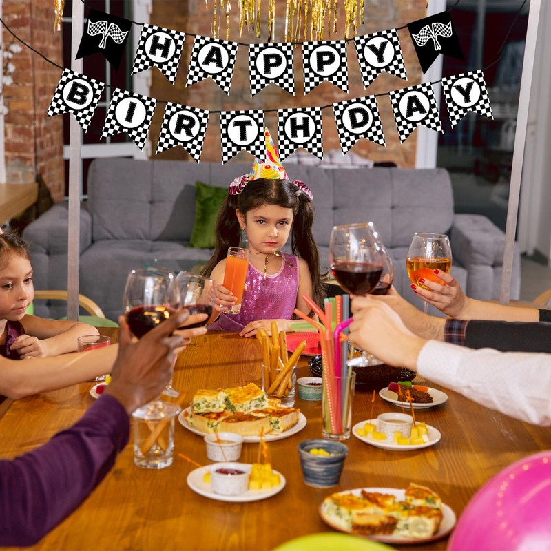 - CHECKERED FLAG & RACING LETTER DESIGN: Each letter showcases a bold black and white checkered flag pattern, giving the banner a fun, race track finish-line feel. The racing-inspired lettering adds excitement and complements any race car-themed party decor, making it ideal for young car lovers.