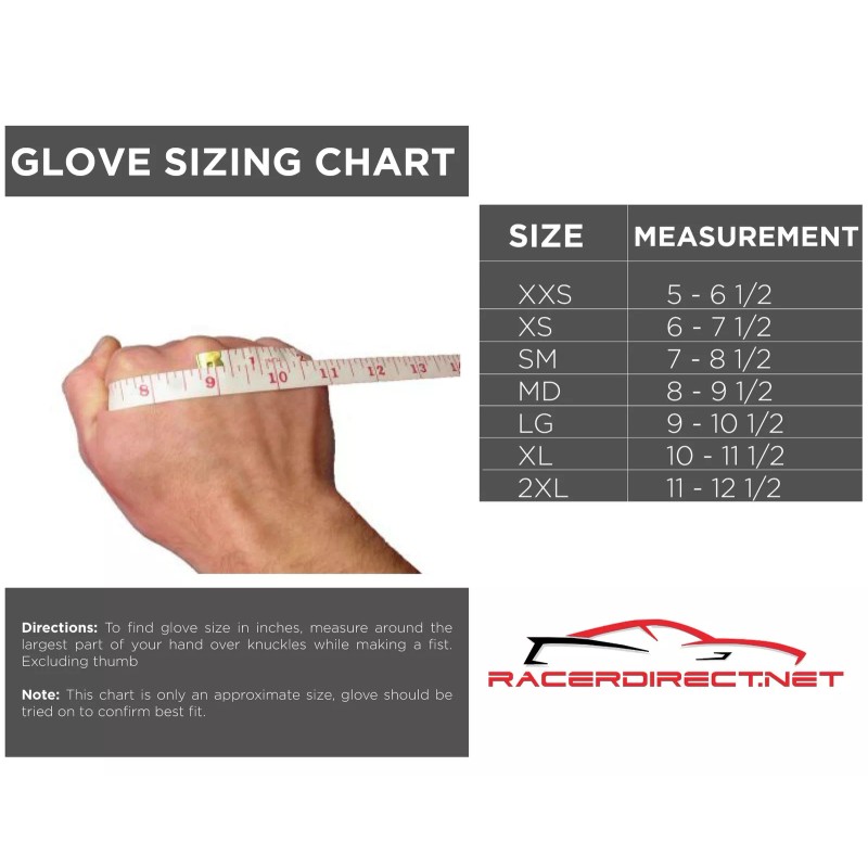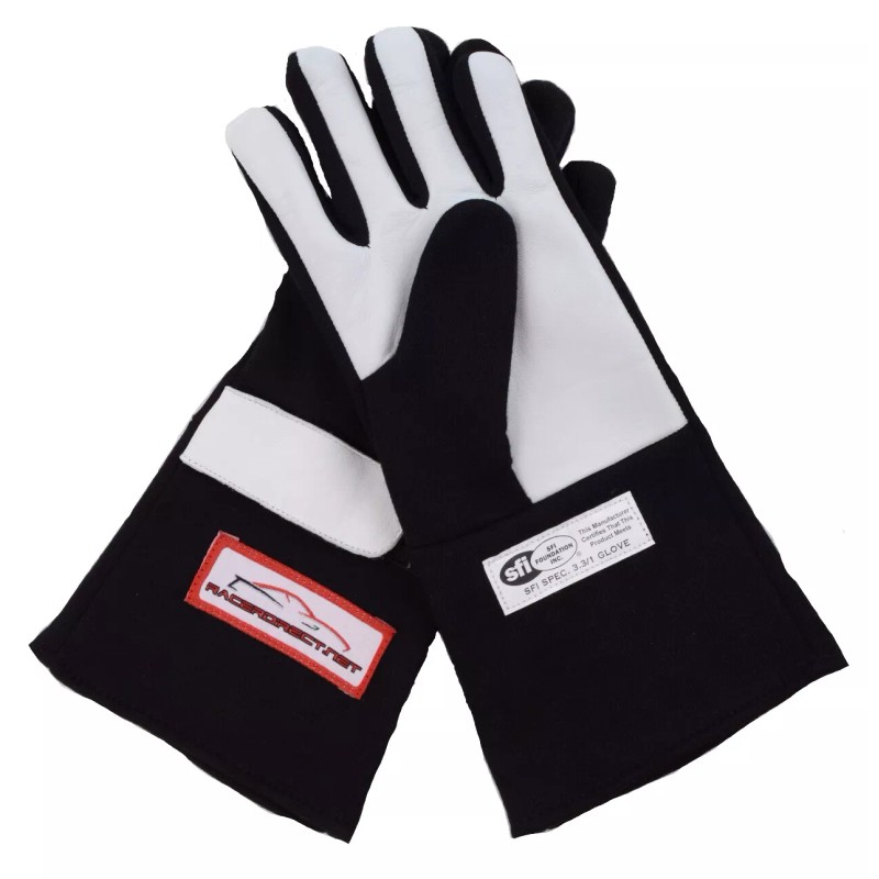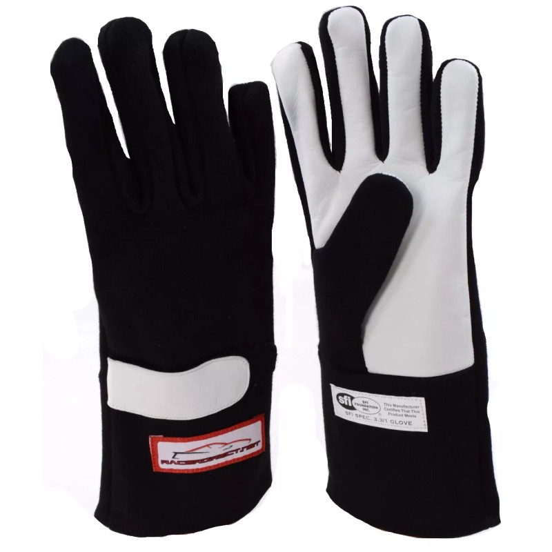 This listing is for a pair ( left and right ) Racerdirect.net SFI 3.3/5 Double Layer Racing Gloves. Size 2X (XXL), Color Black. These performance gloves are the total gauntlet style to go over your racing jacket cuffs. There is a Velcro outer strip for extra security. These gloves are constructed from the highest quality materials, which include a leather reinforced palm pad to reduce hand fatigue and grip points for the wheel without sacrificing the softness of the material and your comfort.