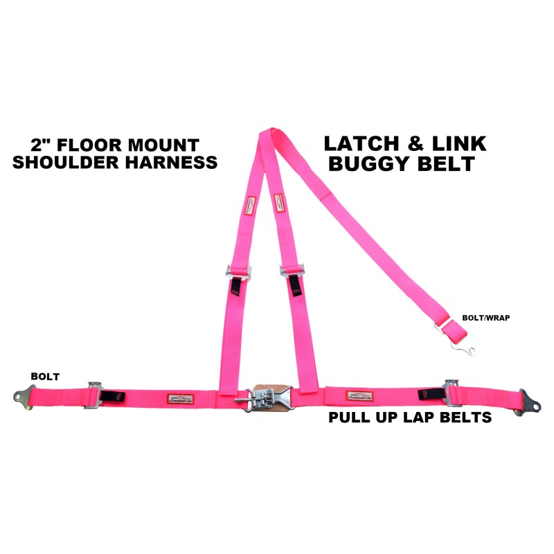 This listing is for a Racerdirect.net 3 Point Latch and Link Racing Harness. The Harness has a 2" Sewn In Pull Down Y Floor Mount Shoulder Harness that Wraps or Bolts to the roll bar that runs just above the floor or to the floor behind the seat. The Lap Belts are 2" Pull Up Lap Belts that Bolt to the chassis. The full extension of the shoulder harness is 80" and the full extension of the lap belts 75".