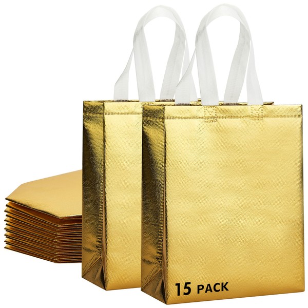 RACETOP 15 Pcs Gold Gift Bags Medium Size, 8x4x10 Inch Reusable Gift Bags with Handles & Sturdy Base, Ideal for Birthday, Wedding, Bachelorette, Party Favors, Holiday Goodie