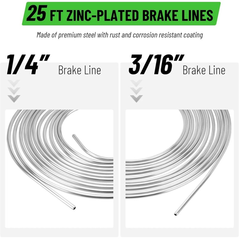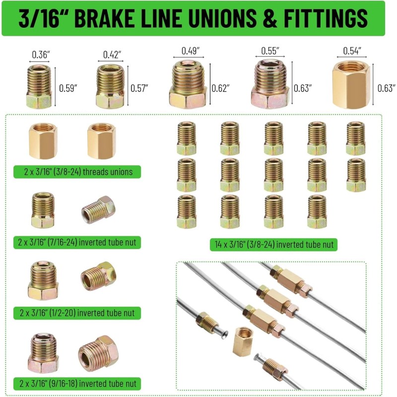 - Premium Material: 3/16 & 1/4 zinc-plated brake line are made of alloy steel to prevent oxidation. All brake pipe fittings are made of anti-rust brass, which has a long service life.