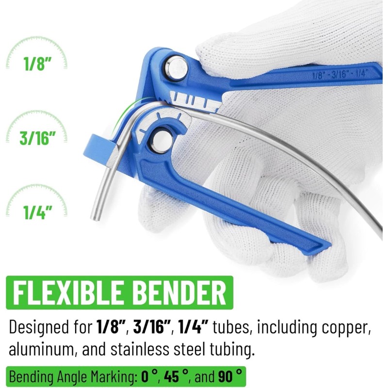 - Flexible Bender & Cutter: Tube bender fits for copper, aluminum, brass, and stainless steel pipes with 1/8", 3/16", and 1/4" O.D. Tube cutter can easily handle pipes ranging from 1/8" to 7/8".