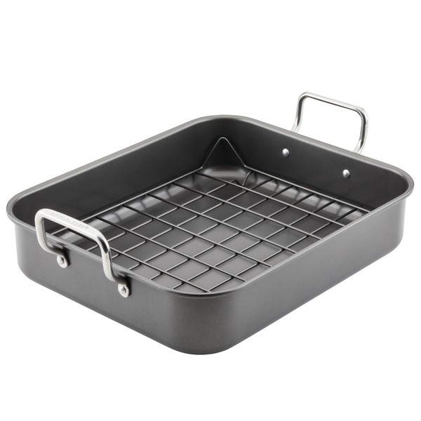 Rachael Ray Bakeware Nonstick Roaster/Roasting Pan with Reversible Rack, 16.5 Inch x 13.5 Inch, Gray