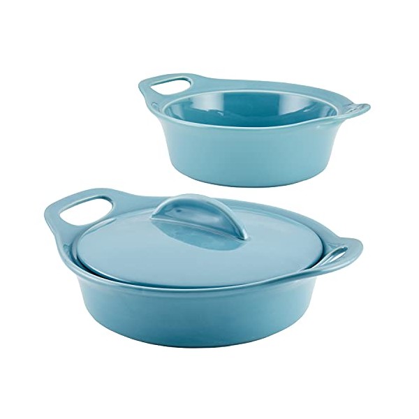 Rachael Ray Solid Glaze Ceramics Casserole Bakeware/Baker Set with Shared Lid, 3 Piece, Agave Blue