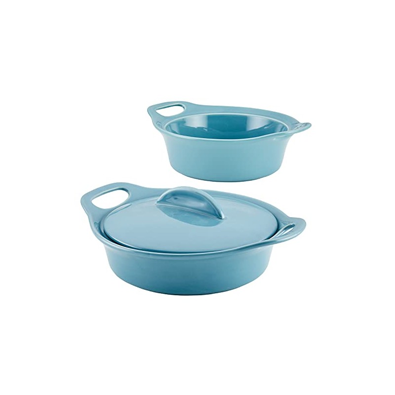 - KITCHEN FRIENDLY STORAGE: Rachael Ray's round bakers are crafted from durable ceramic for stylish and practical baking and serving from oven to table