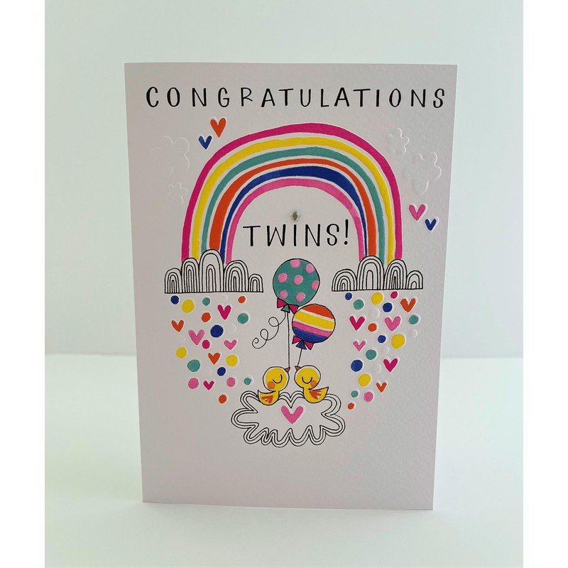 - Congratulations twins card with colourful rainbow, ducks, balloons and hearts design