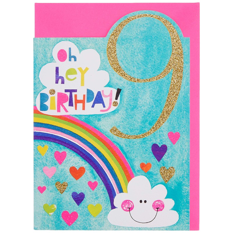 - Oh hey birthday card with fun and colourful number 9, rainbow, clouds and hearts design