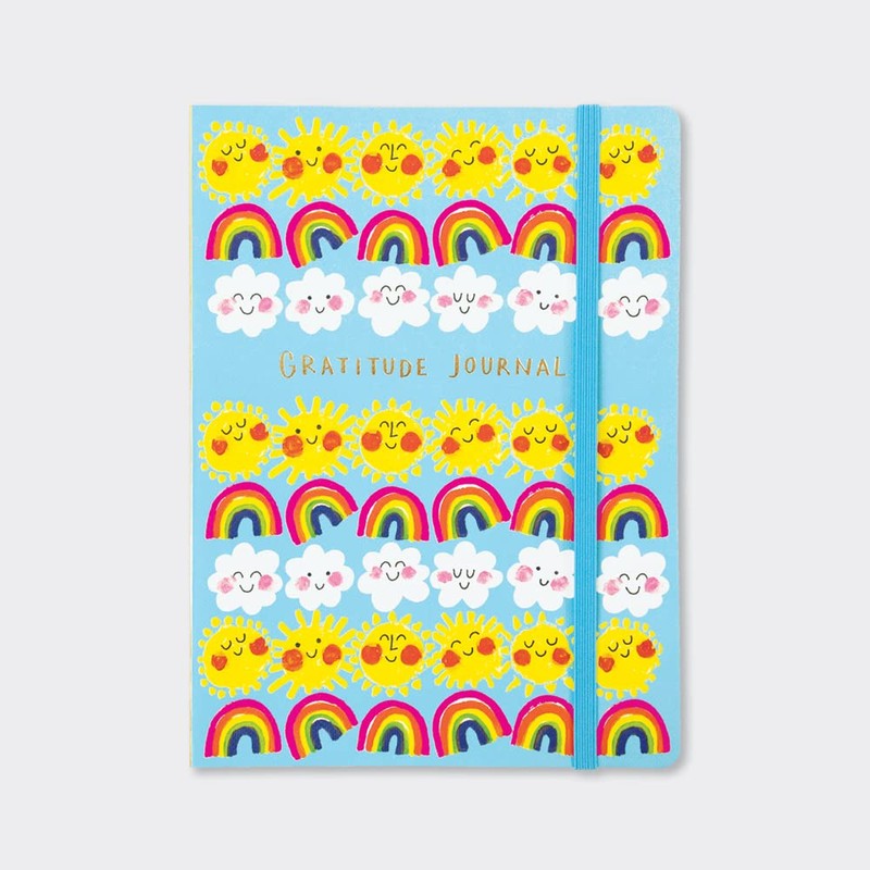 - These chunky, perfect bound notebooks have 240 lined pages, contrasting linings, rounded corners and elastic closers. This beautiful gratitude journal with a sun, rainbows and clouds design is finished with gold foiling. A lovely gift or treat!