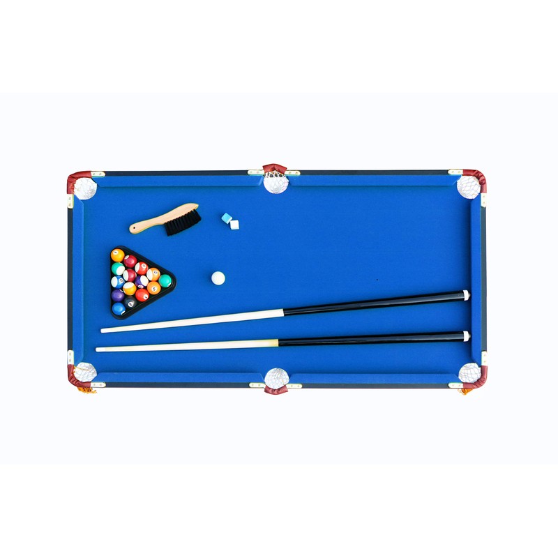 -1 RACK LEO 4-Foot Foldable Billiard/Pool Table -Table Dimensions: 47" L X 25" W X 27" H -Table Weight: 44 Lbs -1/2" MDF Bed with Green Regulation Grade Velvet Felt -L88 Rubber Bumper Cushions -Cotton Net Ball Pockets -1" Leg Levelers to ensure flat surface -2 - 42" Billiard Cues -Set of Billiard Balls (16 - 1.5" resin billiard balls) -2 - Pool Cue Chalk, Wooden Triangle Rack and Premium Brush -Free Same Day Shipping -Lifetime Warranty -Free Additional Billiard Cue and Chalk (Upon Request and Shipped Separately, Contact RACK with your shipping address)