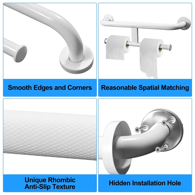 • Multifunctional Design: These grab bars for toilet feature an integrated paper roll holder that can hold two roll papers. Both ends of the toilet roll holder are designed with protrusions to effectively prevent paper from falling off. If installed in the shower, it can also hang a towel and shower sponge, maximizing bathroom utility