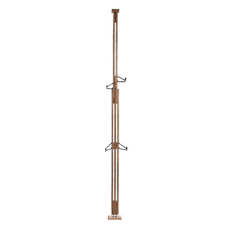 **FEATURES:** The Woody Bike Rack is made of furniture grade solid wood hand selected for both its beauty and it's strength. The solid wood top plate uses protects the ceiling from damage, yet holds the Woody bike rack solidly in place. The solid wood base plate allows for a tight fit and stability on any surface to. Hook and loop straps are to secure the front wheel to the bike frame to keep the front wheel from swinging off center. The vinyl coated arms securely support the bikes while protecting the paint from damage. Each arm is adjusted independently up and down, allowing for an infinite number of configurations to match whatever style of bike you have. The Woody Bike Rack adjusts to accommodate ceiling heights from 7ft to 10 ft.