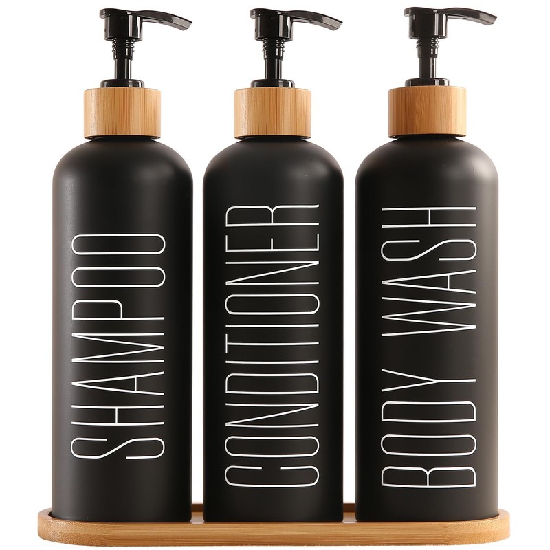 - Labelled soap dispenser - The soap dispenser is labelled "SHAMPOO", "CONDITIONER" and "BODY WASH" to avoid confusion among users. These refillable shampoo bottles with bamboo pump are suitable for bathroom decor and is a guest room must have.