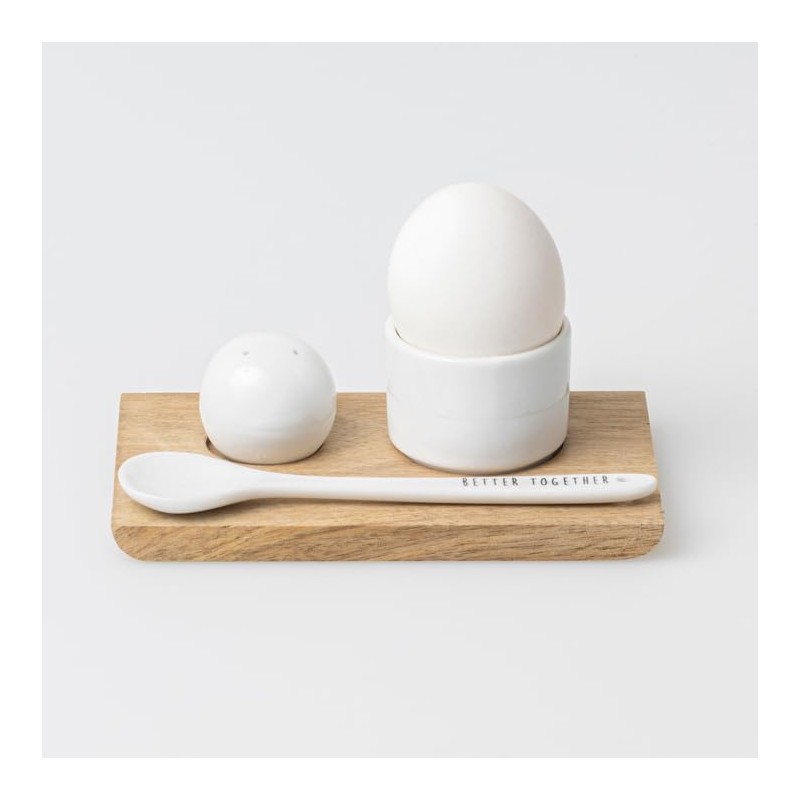 The refined egg cup set from Räder Design consists of a wooden tray, egg cup, egg spoon and even a small salt shaker.
