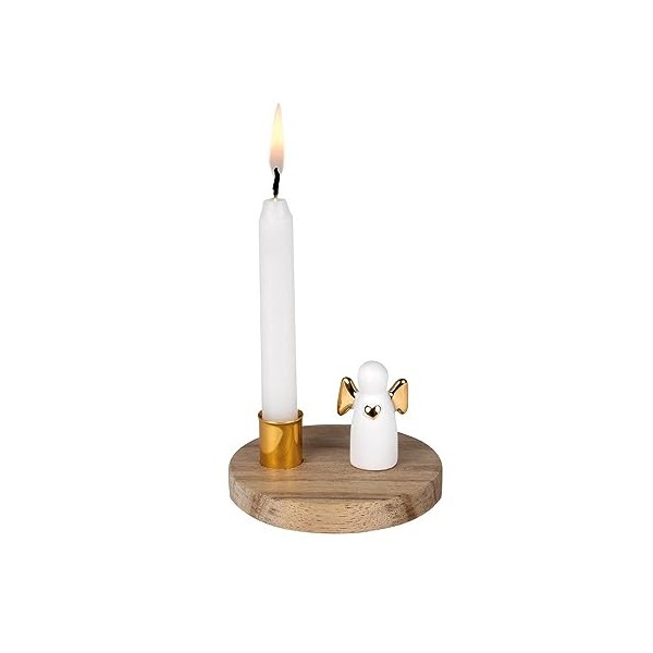 The new light history guardian angel from Räder Design consists of a round wooden tray and a porcelain element. The gold metal holder is designed for a tree candle.