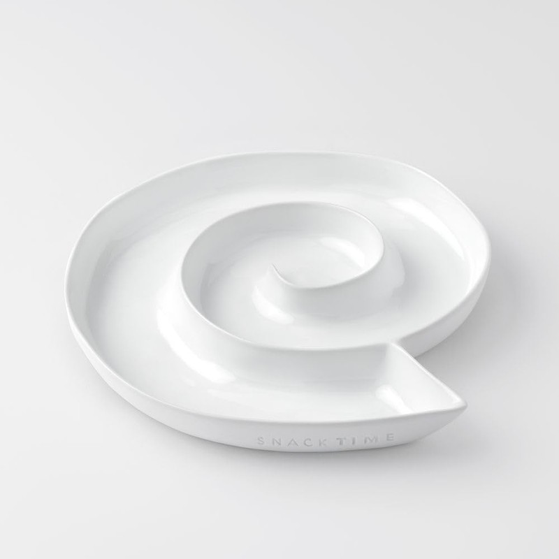 The bowl is shaped like a swirl and bears the embossing "Snacktime" on the outside.